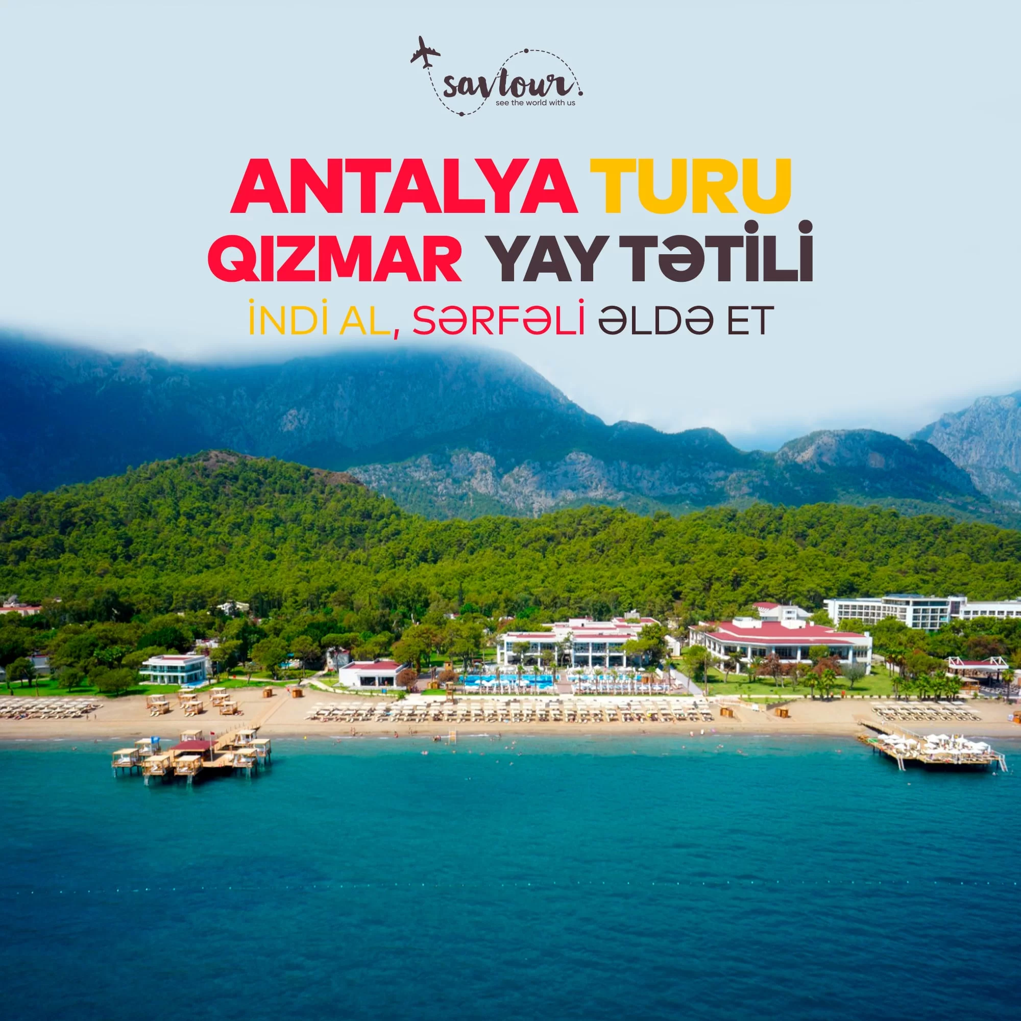 Antalya,Alanya ,Bodrum,Kuşadası,Marmaris,Fethiye istiqamətində, hər bütcəyə uyğun təkliflər var !