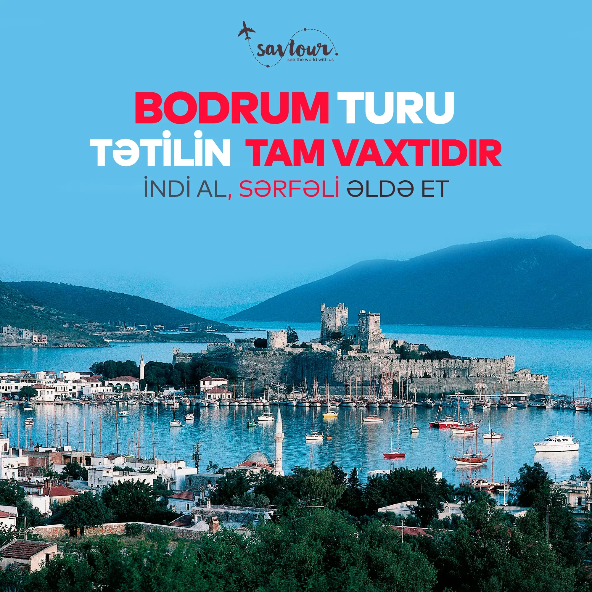 Antalya,Alanya ,Bodrum,Kuşadası,Marmaris,Fethiye istiqamətində, hər bütcəyə uyğun təkliflər var !