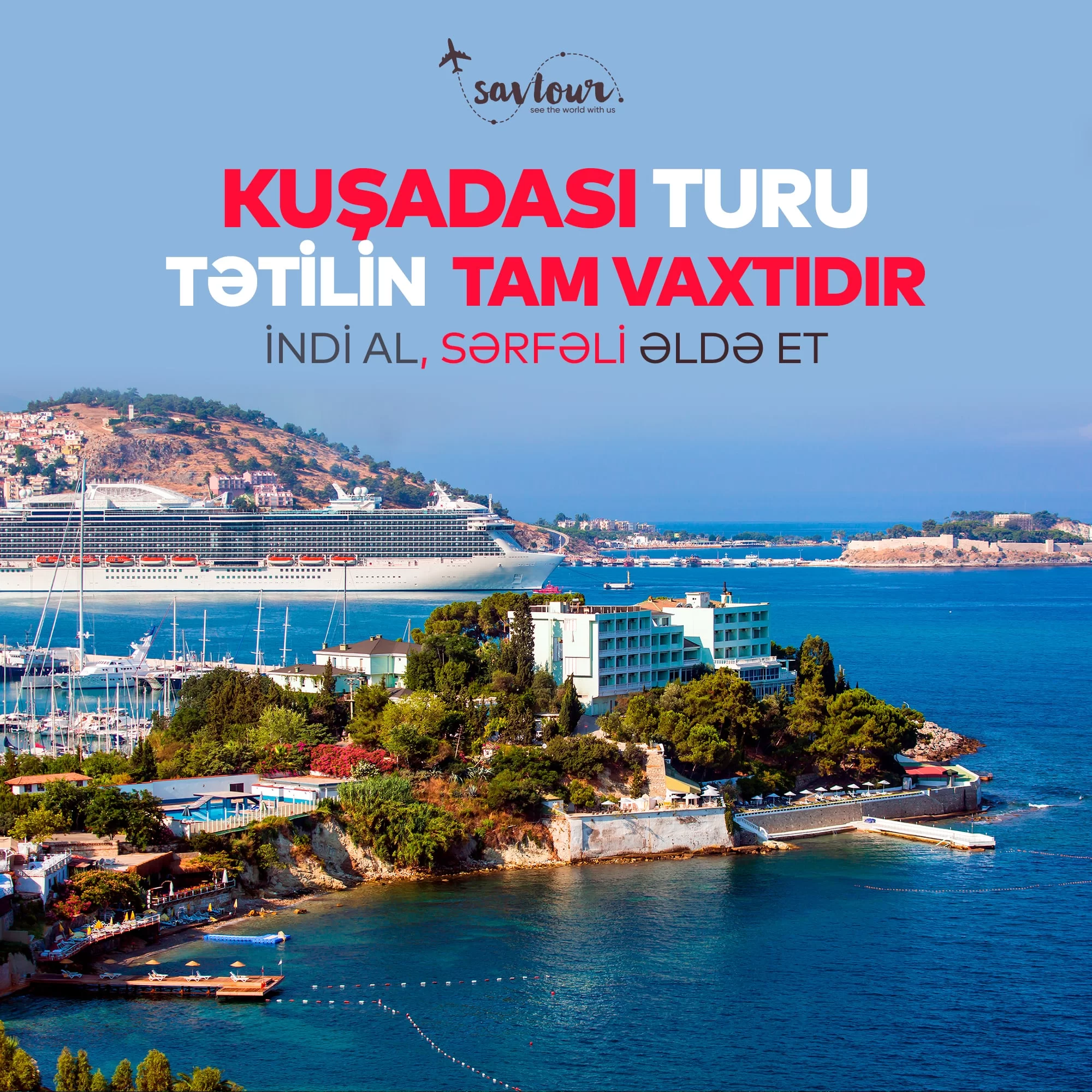 Antalya,Alanya ,Bodrum,Kuşadası,Marmaris,Fethiye istiqamətində, hər bütcəyə uyğun təkliflər var !